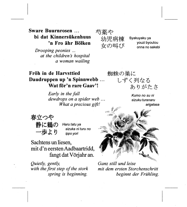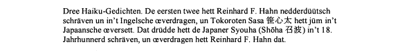 Nu hett Reinhard F. Hahn uns för de eerste Siet de dree Haiku schickt, jeedeen in Japaansch, in Ingelsch un in Plattdüütsch. Wokeen de dree enkelten Gedichten schreben hett, dat steiht dor ünner. - Ok hier seht wi wedder, dat dat Öbersetten in un ut dat Nedderdüütsche goot geiht un dat Nedderdüütsch ebenso passen deit för de Haiku, de Weltliteratur sünd, as de annern Spraken ok. - Nee, Plattdüütsch is nix, wo en so mit ümspringen kann as mit en Muultrummel, de all dat rutbrummt, wat 'n dor rinbrummelt; Plattdüütsch (or Nedderdüütsch, as wi ok seggen köönt), is en Instrument, wo sik feine Stücken un fiene Saken op spelen laat. Un wenn wi fiene Saken op uns Instrument speelt, denn söllt wi ok richtig spelen. De dat nich lehrt hett, de sall de Fingern vun dat Instrument laten, wat he nich spelen kann. Un wo en dat wiest, dat he spelen kann, dor laat uns applauderen! Un wenn en man blot murksen kann, denn sullen dor ok welk vun uns geern mal 'n Woort fallen laten un Bescheed seggen. Dat geiht doch nich an, dat wi mit uns' Plattdüütsch Schindluder drieben laat. Literatur is dat, wat F o r m hett. Wat keen Form hett, dat mag amüsant sien, man Literatur is dat denn nich.